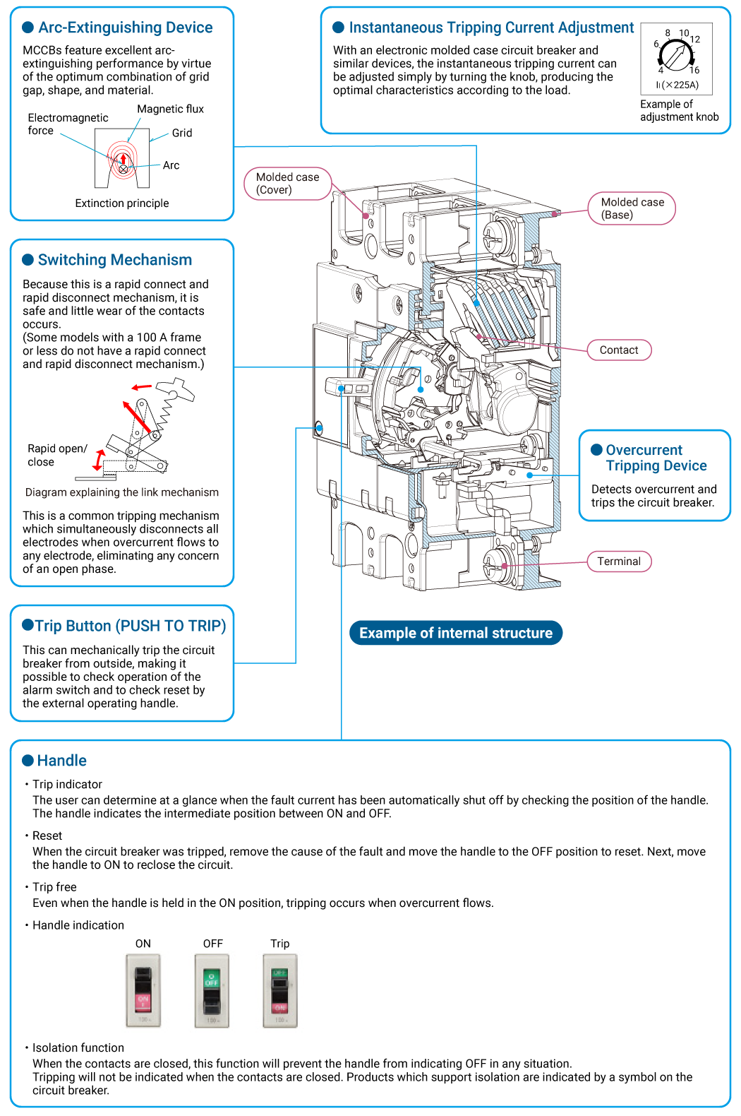 Used for electric circuit protection and open/close of low-voltage circuits (600VAC or less, 750VDC or less).