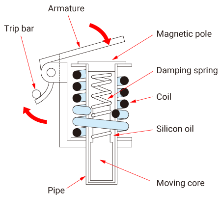 - Instantaneous tripping operationWhen a large current flows, the moving metal piece is attracted instantaneously, moving the trip bar without waiting for the moving iron core to move.