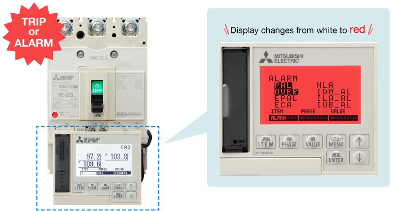 The load current, line voltage, power, electric energy, harmonic current, leakage current, and power factor passing through the circuit breaker are measured and displayed, allowing for detailed energy management for improved energy savings.