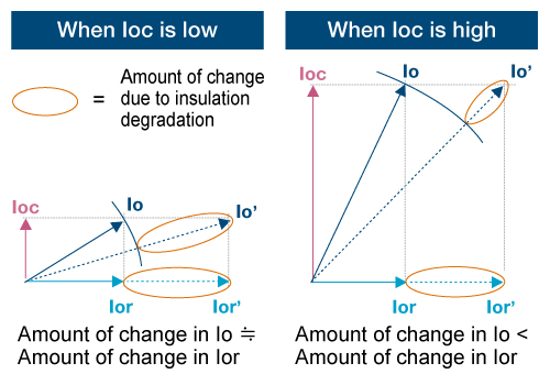 Ioc is higher in equipment with long wiring distances or with inverter devices or various filters installed, so detecting insulation degradation (due to small changes in Io) becomes difficult and Ior measurement is more effective.