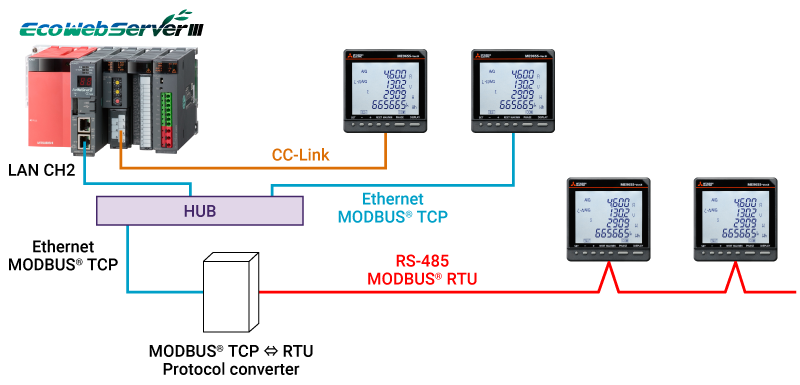 ME96SS has MODBUS® RTU (RS-485) communication function as standard. Also there are available optional modules usable CC-Link communication and MODBUS® TCP communication in an Ethernet network.
