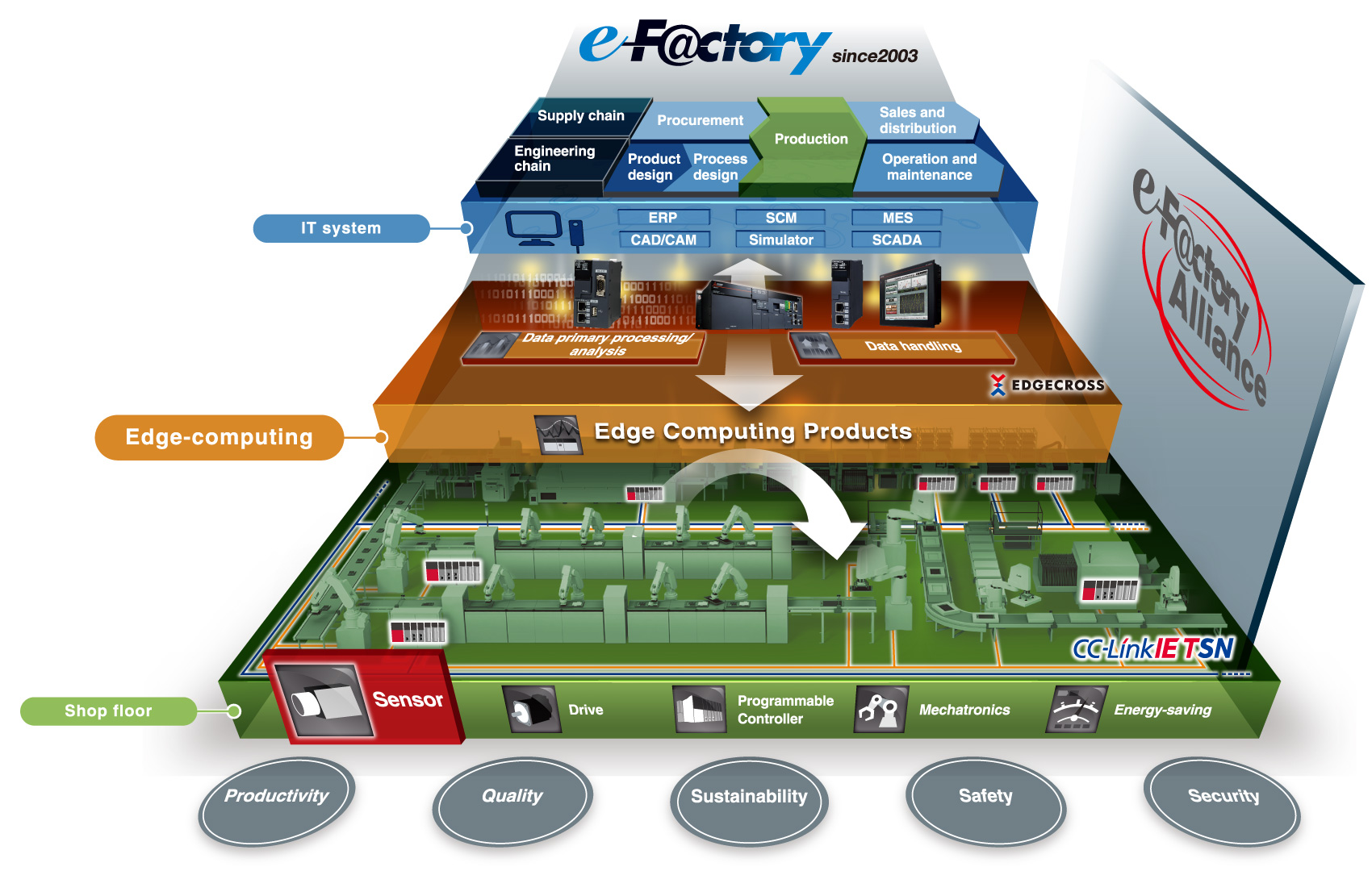 e-F@ctory is the Mitsubishi Electric solution for improving the performance of any manufacturing enterprise by enhancing productivity, and reducing the maintenance and operations costs together with seamless information flow throughout the plant by using a combination of factory automation and IT technologies.