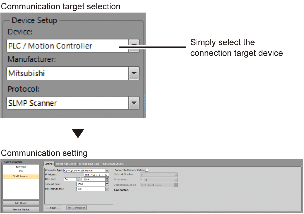 Communication with various factory automation products such as programmable controllers, robots, and motion controllers is possible just by selecting a communication target. Communication setting time can be substantially reduced.