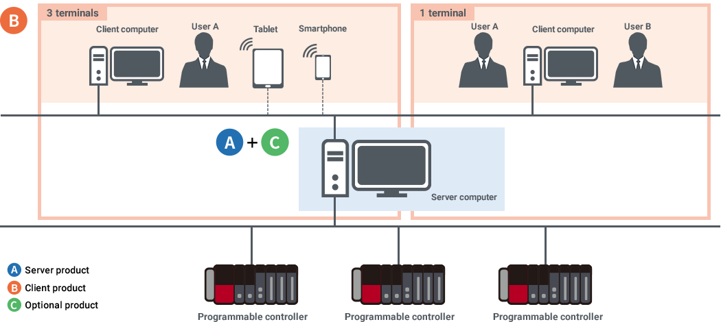 - *B:The client product expresses the maximum number of accesses that will be accepted from the client terminal to the server. Installing and configuration upon introduction of a client product is performed on the server side.