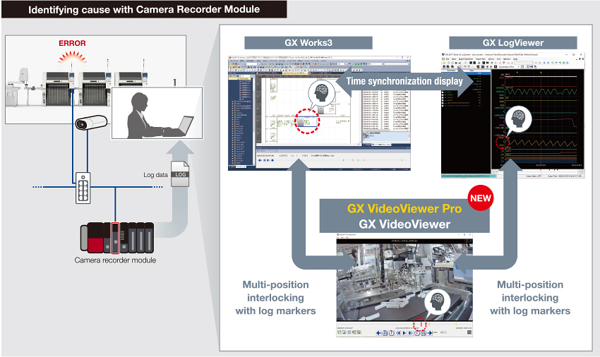 The system recorder*1 performs system-wide recording of equipment operation data and camera images in the event of an abnormality. Analysis is made easy by displaying waveform data, programs, and video data on the same timeline. Also, GX VideoViewer Pro analyzes the video footages and indicates areas different from normal operation (differences), and milestone points (log markers) are added automatically in the meantime.
