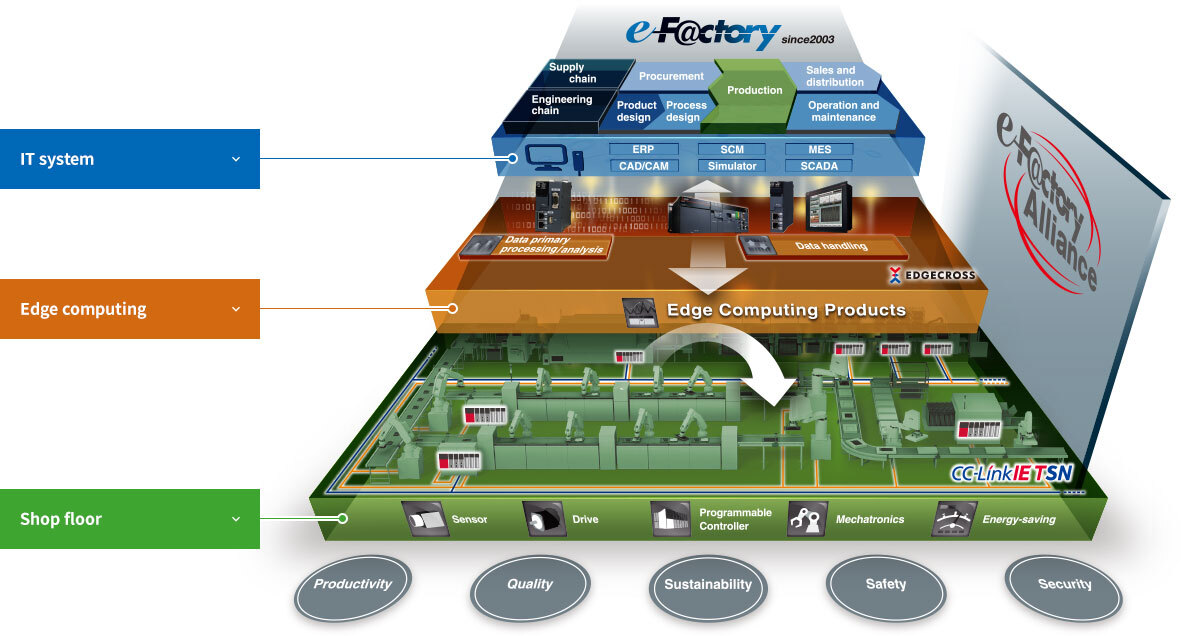 e-F@ctory consists of three stages: "Shop floor", "IT system", and "Edge computing" which links them.