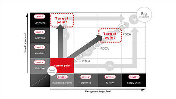 Mitsubishi Electric utilizes SMKL to evaluate the promotion level of e-F@ctory at the manufacturing site and creates an improvement plan for the manufacturing site.