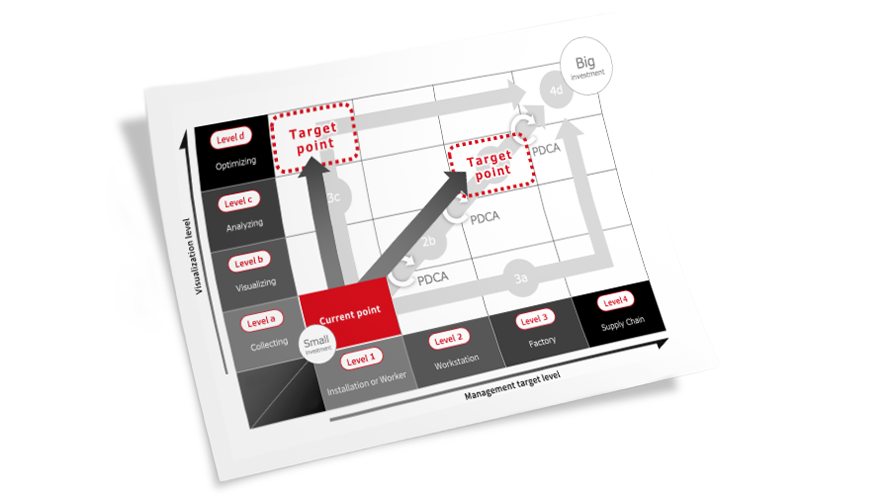 Select the IoT level you aim to achieve from 16 elements of SMKL, and confirm the products and solutions required to achieve the goal.