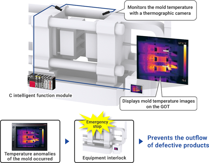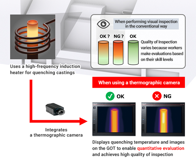 - The casting quality is improved by displaying temperature data detected by the thermographic camera as pseudo-color images on the GOT, enabling visualization.