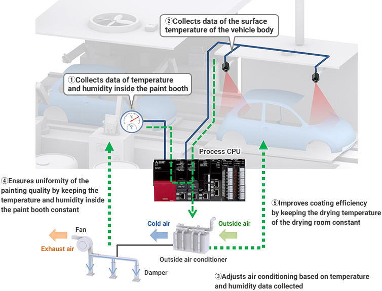 | Ensuring uniformity of the painting quality by controlling the temperature and humidity, and adjusting the air intake/exhaust balance of the paint booth | Control temperature (using PID control) and air conditioning to ensure uniformity of the painting quality. |