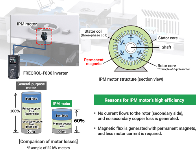 - The IPM motor with a built-in permanent magnet has less motor loss than a general-purpose motor.