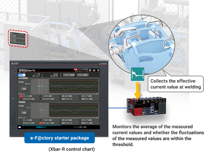 - Manage production processes and maintain welding quality by monitoring quality fluctuations in real time with an Xbar-R control chart of e-F@ctory starter package.
