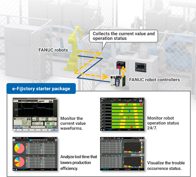 | Improving an operating rate by monitoring the operations of welding robots | Visualize the robot operation status and identify the cause of troubles with e-F@ctory starter package. |