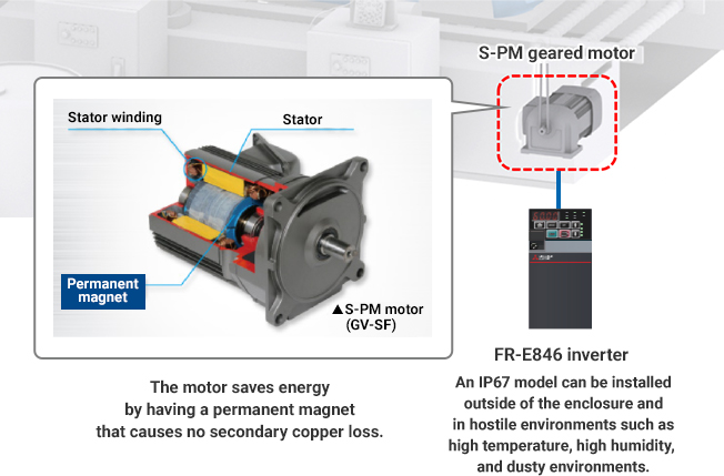 Unlike induction motors, the motor does not show slipping (drop in rotation speed under increased load), and it is suitable for high-accuracy speed control. - An IP 67 model of inverters improves environmental resistance and allows installation in various equipment and environments, including corrosive environments and surrounding air temperatures between -20°C and 60°C.