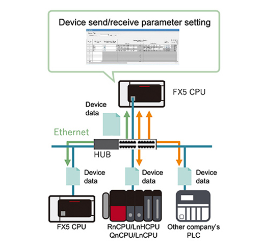 - Multi PLC data sharing among PLCs for upstream and downstream processes via built-in Ethernet can be performed by just performing easy parameter settings to reduce costs.