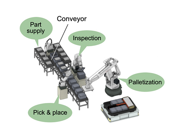 - High-speed palletizing work using robots. Optimize arm length and structure for palletization work and improve freedom of layout.
