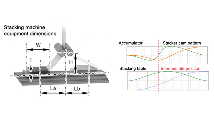 - Use an electronic cam to control the separator feed amount to match the left-right movement of the stacking table. Stabilizing separator feed operation will enable reducing cycle time.