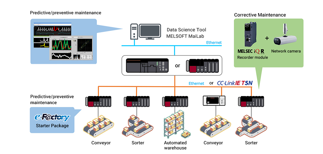 ❶ With AI and edge computing technology Predictive and preventive maintenance at the warehouse/machine/equipment level ❷ With a system recorder and general-purpose camera corrective maintenance solution |