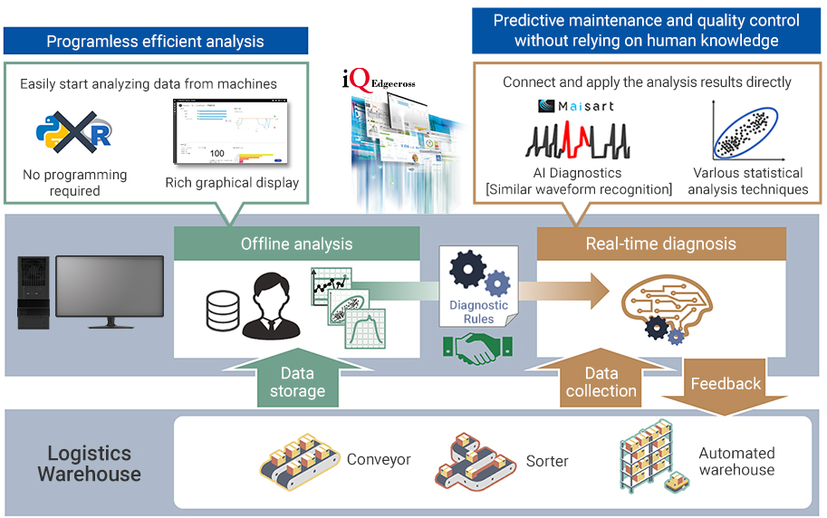 AI / edge computing technology and statistical methods enable real-time diagnosis and offline analysis of field data in one product. Predictive maintenance is possible by extracting diagnostic rules by offline analysis of the accumulated data and feeding back the diagnostic results to the site in real time.