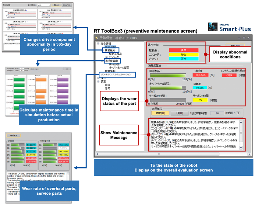 The degree of wear of the driving parts is estimated from the operating state of the robot. Notification of maintenance timing (dedicated signal output and warning output), Support for efficient maintenance, including prioritization of maintenance (grease, belt, reduction gear, ball screw, bearing)